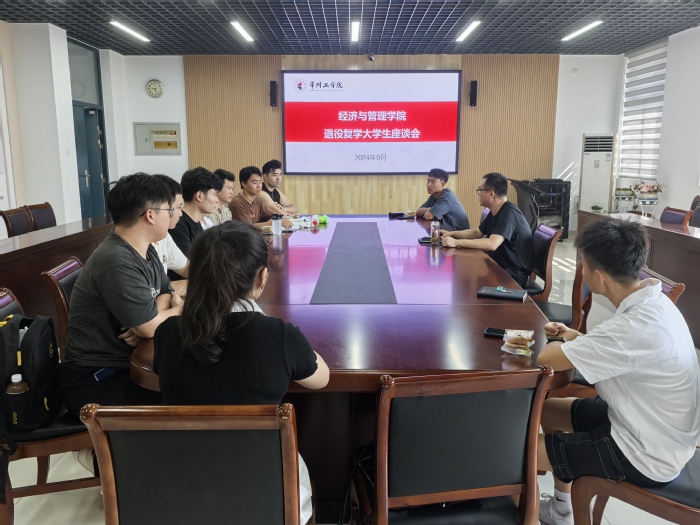 9月14日,经济与管理学院退役复学大学生座谈会在瑶光楼A201室召开。本次座谈会旨在进一步了解退役大学生的学习生活和思想状况,帮助新退役复学学生尽快转变角色,适应校园生活。经济与管理学院党委副书记郭峥春主持会议。