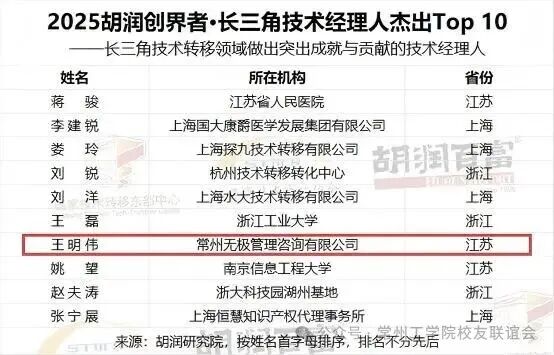 近日,致力提供商业领域榜单与调研的胡润研究院发布了《2025胡润创界者·长三角技术经理人》榜单,包括“2025胡润创界者·长三角技术经理人领军Top 5”与“2025胡润创界者·长三角技术经理人杰出Top 10”。我校96国际贸易、21工商管理本(函)班的“双料校友”王明伟荣列“技术经理人杰出Top 10”,是榜单中唯一一位江苏民营企业代表。