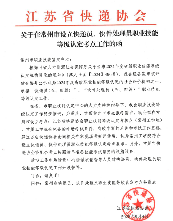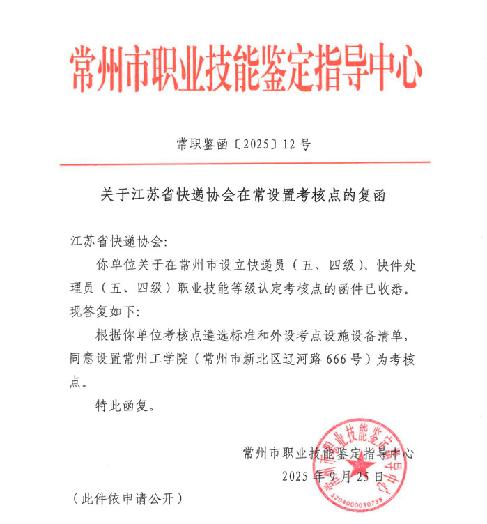 近日,常州市职业技能鉴定指导中心正式复函江苏省快递协会,同意在我校设立职业技能等级认定考核点。这一资质的获批,标志着我校正式成为江苏省物流快递行业高技能人才的重要评价基地,是学校深化产教融合、服务地方行业发展的又一举措。
