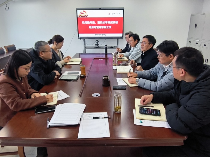 校党委常委、副校长李雄威带队调研经济与管理学院,社科处处长何虹、研究生处处长张燕红陪同调研。经济与管理学院全体领导班子成员参加座谈。
