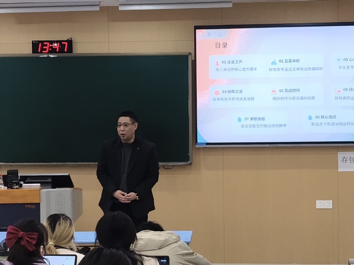 讲座中,郭欣围绕用人单位核心能力要求、本校财务专业近五年就业数据解析、毕业生专业化工作心理建设、科学规划与职场关系处理、简历制作与面试技巧、财税类职业资格考试趋势、应届生就业路径推荐,以及新业态下就业机遇与挑战等八大模块展开系统讲解。他结合具体内容为同学们提供针对性指导,鼓励大家夯实专业基础、明确发展方向,以积极心态迎接未来求职挑战。讲座结束后,郭欣与同学们互动交流,耐心解答就业相关疑问,并就简历与推荐信的撰写提出建议。